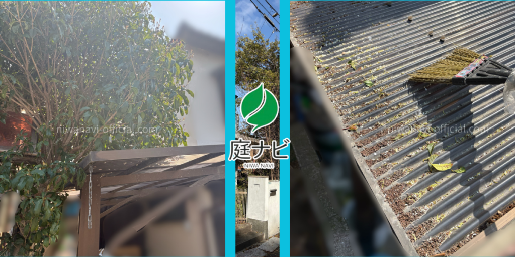 カーポートに覆いかぶさった金木犀の伐採前後の写真